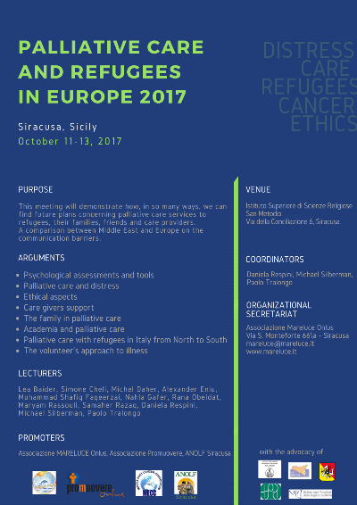 News Siracusa: l’Associazione MARELUCE Onlus centro per la gestione delle relazioni umane e delle risorse spirituali, l’Associazione Promuovere onlus, attiva nelle problematiche dei lungoviventi da cancro e Anolf Siracusa, hanno promosso un meeting internazionale, sul tema “Palliative care and refugees in Europe 2017”.