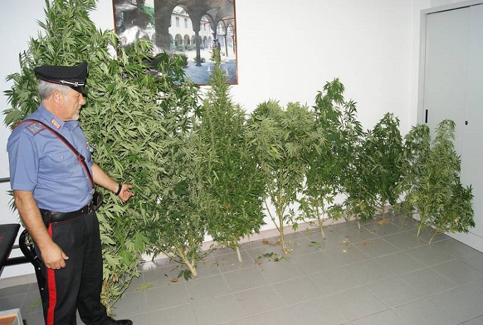 Al termine delle attività infatti i Carabinieri hanno rinvenuto nella sua disponibilità, piantate nel giardino adiacente l’abitazione, 10 piante di cannabis indica dell’altezza media di un metro, di cui due in infiorescenza. Al termine di tale atto l’uomo è stato accompagnato presso gli uffici del Comando Stazione Carabinieri, ove è stato deferito in stato di libertà per il reato di detenzione ai fini di spaccio di sostanza stupefacente.