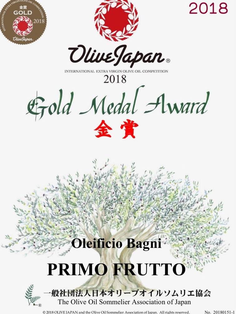 L’Oleificio Bagni non è nuovo alle “Gran Menzioni” e ai riconoscimenti per le sue produzioni biologiche, ottenute nei più importanti appuntamenti fieristici internazionali che ogni anno si svolgono in Italia e in Europa. I suoi oli sono presenti nella Guida del Gambero Rosso, e da qualche anno si stanno facendo spazio, ottenendo apprezzamenti, nei mercati internazionali, in Giappone, Stati Uniti e Canada.