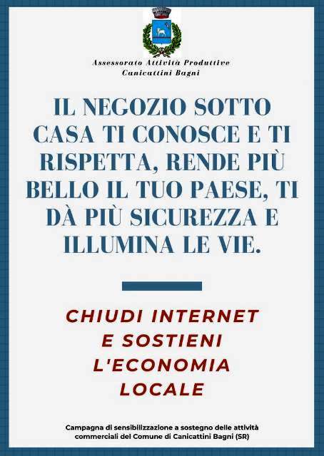 Esortazioni agli acquisti a km zero, dunque, quelli che l’Assessore Gazzara a nome del Sindaco Marilena Miceli e di tutta l’Amministrazione comunale rinnova ai propri concittadini, con una campagna sul sito web del Comune www.comunedicanicattinibagni.it e sui social, sperando che ogni cittadino si trasformi in una vera e propria cassa di risonanza verso gli altri, gli amici, i parenti, i conoscenti.