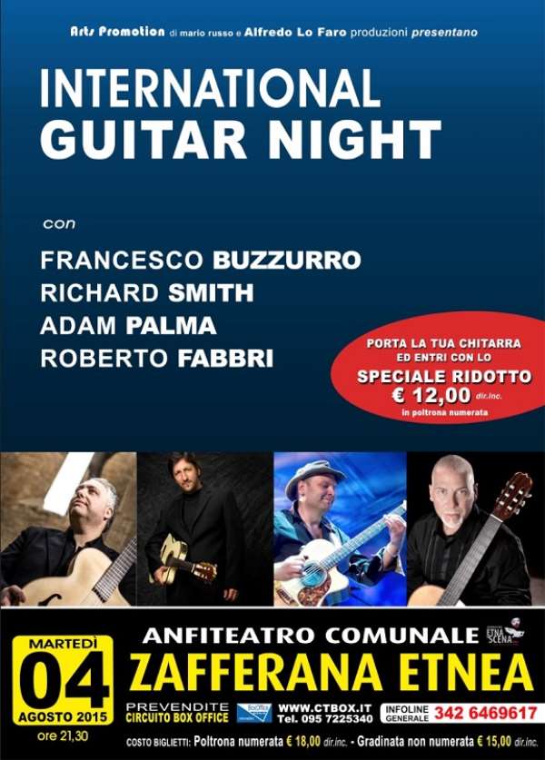 Saranno proprio quattro dei migliori chitarristi al mondo che, riuniti in un unico palcoscenico, condivideranno la luce dei riflettori. L’agrigentino Francesco Buzzurro, il romano Roberto Fabbri, lo statunitense Richard Smith ed il polacco Adam Palma si esibiranno in composizioni standard e originali dando ampia dimostrazione della propria classe e unicità. Unico assente di serata, il chitarrista tedesco Peter Finger che non potrà partecipare all’International Guitar Night per sopraggiunti impegni personali.