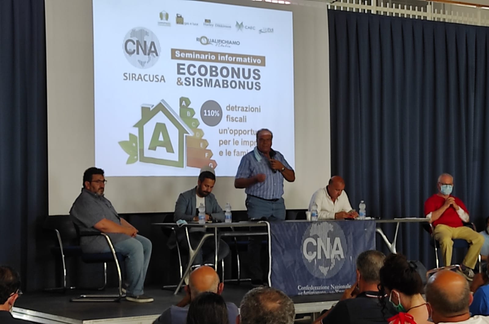 A seguire le relazioni tecniche di Vincenzo Scatà, responsabile di progetto di CNA Siracusa e di Sebastiano Caggia, amministratore del consorzio CAEC, partner di CNA Sicilia e di ENI per le operazioni di cessione del credito e di esecuzione dei lavori, interventi che hanno illustrato le peculiarità della norma e delle agevolazioni, gli aspetti tecnici e procedurali con un proficuo dibattito in una sala attenta e che ha occupato ogni singolo posto disponibile, ridotti in ossequio alle misure anti Covid.