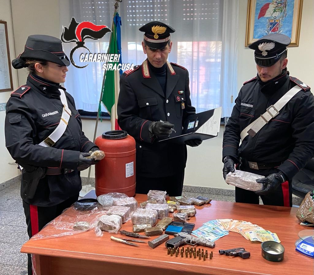 un pregiudicato siracusano di 51 anni e il figlio minorenne di 17 anni per detenzione di stupefacenti, poiché in possesso di circa 5 chili e mezzo di hashish e marijuana, 1.800 euro in contanti e 2 pistole calibro 7,65 e calibro 22. Il minore non era estraneo all’attività criminale del padre e durante le perquisizioni si è dato dal retro dell’abitazione portando con sé un bidone in plastica, precedentemente semi interrato, in cui era nascosta gran parte della droga e una pistola. I militari lo hanno raggiunto e arrestato e su ordine della Procura dei Minori collocato in un centro di accoglienza, mentre il padre del ragazzo è stato tradotto in carcere;