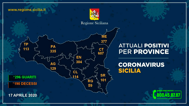 Questa la divisione degli attuali positivi nelle varie province: Agrigento, 129 attuali positivi (0 ricoverati, 2 guariti e 1 deceduto); Caltanissetta, 114 attuali positivi (15 ricoverati, 14 guariti e 10 deceduti); Catania, 607 attuali positivi (114 ricoverati, 73 guariti e 65 deceduti); Enna, 304 attuali positivi (170 ricoverati, 29 guariti e 25 deceduti); Messina, 377 attuali positivi (127 ricoverati, 52 guariti e 38 deceduti); Palermo, 335 attuali positivi (71 ricoverati, 44 guariti e 25 deceduti); Ragusa, 59 attuali positivi (5 ricoverati, 5 guariti e 5 deceduti); Siracusa, 101 attuali positivi (58 ricoverati, 60 guariti e 16 deceduti); Trapani, 113 attuali positivi (7 ricoverati, 17 guariti e 5 deceduti).