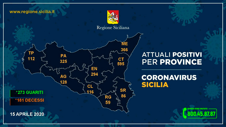 Questa la divisione degli attuali positivi nelle varie province: Agrigento, 128 positivi (0 ricoverati , 2 guariti e 1 deceduto); Caltanissetta, 116 positivi (17 ricoverati, 11 guariti e 10 deceduti); Catania, 595 positivi (124 ricoverati, 65 guariti e 65 deceduti); Enna, 294 positivi (176 ricoverati, 24 guariti e 22 deceduti); Messina, 366 positivi (132 ricoverati, 46 guariti e 37 deceduti); Palermo, 325 positivi (71 ricoverati, 44 guariti e 24 deceduti); Ragusa, 59 positivi (6 ricoverati, 4 guariti e 5 deceduti); Siracusa, 86 positivi (56 ricoverati, 60 guariti e 12 deceduti); Trapani, 112 positivi (8 ricoverati, 17 guariti e 5 deceduti).