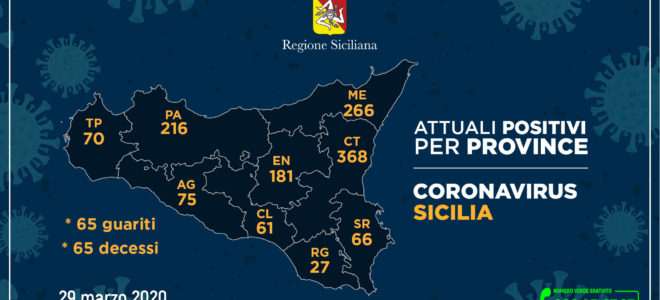 Questa la divisione degli attuali positivi, dei ricoverati, dei guariti e dei deceduti nelle varie province: Agrigento, 75 (0 ricoverati, 2 guariti e 1 deceduto); Caltanissetta, 61 (19 ricoverati, 3 guariti, 4 deceduti); Catania, 368 (136 ricoverati, 16 guariti, 23 deceduti); Enna, 181 (92 ricoverati, 1 guarito, 10 deceduti); Messina, 266 (129 ricoverati, 8 guariti, 15 deceduti); Palermo, 216 (78 ricoverati, 14 guariti, 6 deceduti); Ragusa, 27 (7 ricoverati, 3 guariti, 2 deceduti); Siracusa, 66 (35 ricoverati, 18 guariti, 3 deceduti); Trapani, 70 (26 ricoverati, 0 guariti, 1 deceduto).