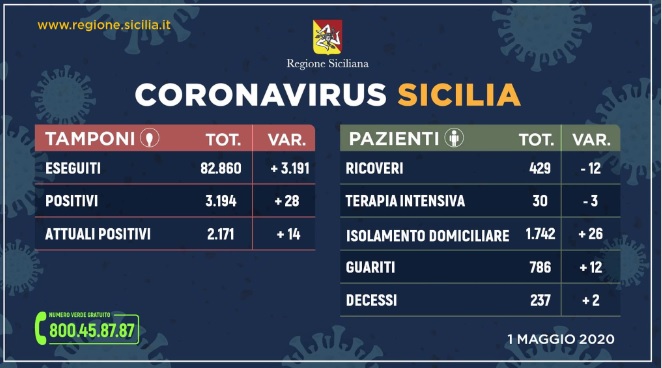 Questo il quadro riepilogativo della situazione nell’Isola, aggiornato alle ore 15 di oggi (venerdì 1 maggio), in merito all’emergenza Coronavirus, così come comunicato dalla Regione Siciliana all’Unità di crisi nazionale.