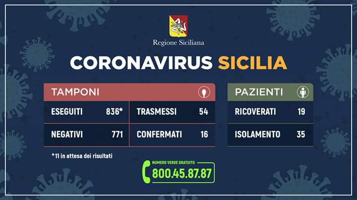 I Policlini di Palermo e Catania hanno effettuato 836 tamponi, di cui 771 negativi e 11 in attesa di risultati.