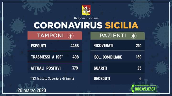 News Sicilia. Il quadro riepilogativo in merito all’emergenza Coronavirus nell’Isola ci dice che i tamponi validati dai laboratori regionali sono 4.468 e attualmente risultano positive 379 persone.
