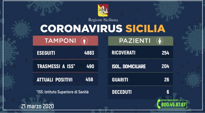 Dall’inizio dei controlli, i tamponi validati dai laboratori regionali di riferimento (Policlinici di Palermo e Catania) sono 4.883. Di questi sono risultati positivi 490 (+ 82 rispetto a ieri), mentre, attualmente, lo sono 458 persone (+79 rispetto a ieri).