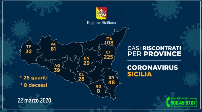 Questi i casi di coronavirus riscontrati nelle varie province dell’Isola, aggiornati alle ore 12 di oggi (domenica 22 marzo), così come segnalati dalla Regione Siciliana all’Unità di crisi nazionale.