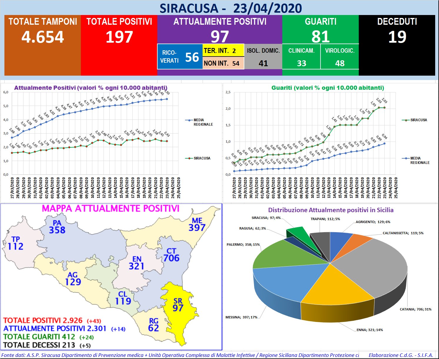 Rapporto, però, che a detta dell’Asp «non presenta significativi scostamenti tra le province siciliane, a meno che l’“esperto” si sia basato sulla proporzione di decessi osservati a Siracusa (che al 23 aprile erano 19) sul totale dei positivi in atto (97)».
