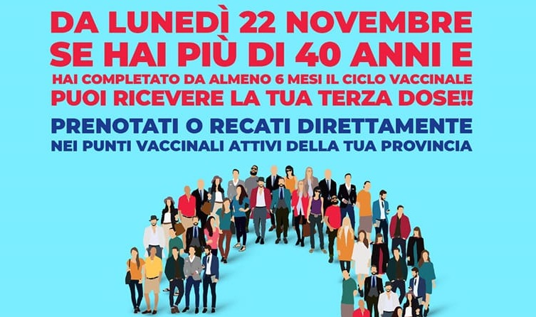 Al via in Sicilia da lunedì 22 novembre, le somministrazioni della terza dose di vaccino anti-Covid anche al target 40-59 anni. Lo ha disposto l’Assessorato regionale alla Salute, come previsto dall’ultima circolare del Commissario nazionale per l’emergenza Covid-19.