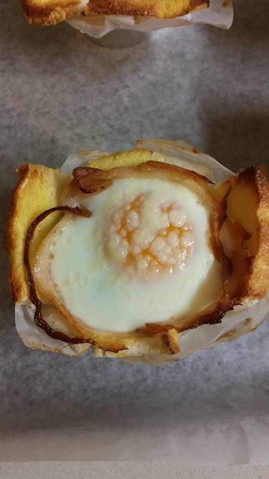 “Ho tagliato in due una fetta di pane per tramezzini e poi ancora in due. Ho spennellato le parti del pane con dell’uovo. Ho rivestito dei pirottini di alluminio con carta da forno ed ho sistemato in ogni pirottino quatto pezzi di pane, modellandolo con le mani. Potete farcire, in realtà, il tutto come meglio credete. Per terminare ho spennellato i bordi del pane e messo in forno a 180gr. per 15-20 minuti.