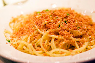 Poi unite un bicchiere d’olio d’oliva, 3 spicchi d’aglio finemente affettati, prezzemolo tritato ed una foglia di basilico. Una breve cottura (3 minuti), poi subito sui bucatini (800 gr.) che, scolati e rimessi in tegame, vanno mescolati energicamente.