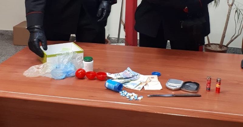 Nel corso della perquisizione domiciliare i Carabinieri hanno rinvenuto in un ripostiglio dell’abitazione dell’uomo ulteriori 25 dosi di cocaina per un peso complessivo di 8 grammi circa, un bilancino di precisione, un coltello da cucina con lama intrisa di sostanza stupefacente, materiale vario atto al confezionamento e una somma in denaro pari ad euro 180, in banconote di piccolo taglio, probabile provento spaccio.