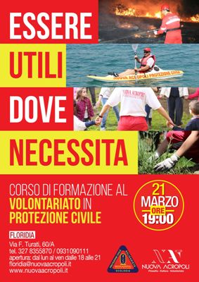 Nuova Acropoli continuerà, senza sosta, le sue attività formative e per questo il prossimo 21 Marzo alle ore 19, si aprirà il nuovo Corso di Formazione al volontariato in Protezione Civile presso la sede in Viale Turati n°60/A, a Floridia.