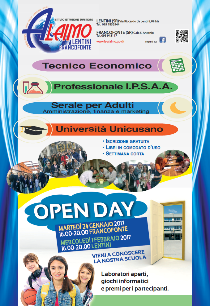 News Francofonte: l’Istituto Tecnico Commerciale “Alaimo” da Lentini con sede in C/da Sant’Antonio apre le porte ai genitori in occasione dell’Open Day che si terrà martedì 24 gennaio, a partire dalle 16.00 e fino alle 20.00.