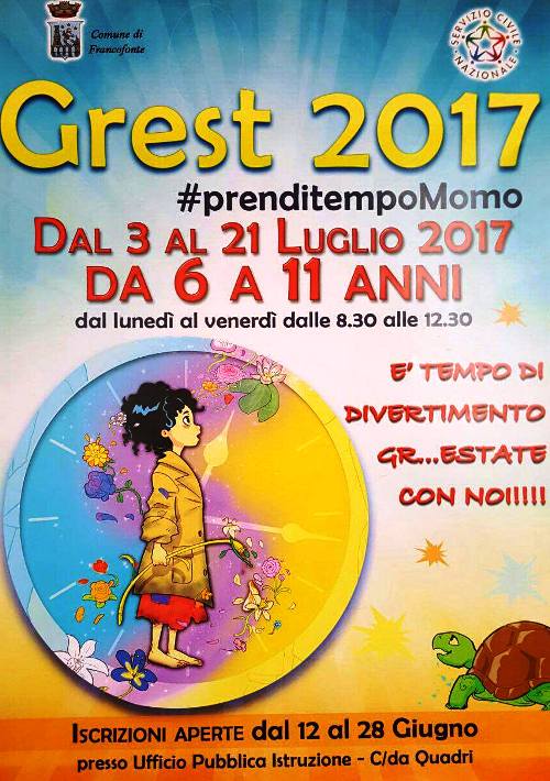 News Francofonte: con l’arrivo della stagione calda, torna l’appuntamento con il Grest. L’edizione 2017 si terrà dal 3 al 21 luglio. Dal lunedì al venerdì, dalle ore 8.30 alle ore 12.30, giochi e tanto divertimento per i piccoli che saranno assistiti dai ragazzi del Servizio Civile.