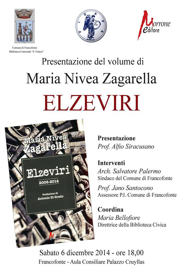 News Francofonte: sarà presentato oggi, alle 18, presso l’aula consiliare di Palazzo Gravina-Cruyllas, il nuovo libro della prof.ssa Maria Nivea Zagarella, già docente di Lingua e Letteratura Italiana e Latina al Liceo Classico “Gorgia” di Lentini, “Elzeviri“, edito da Morrone.