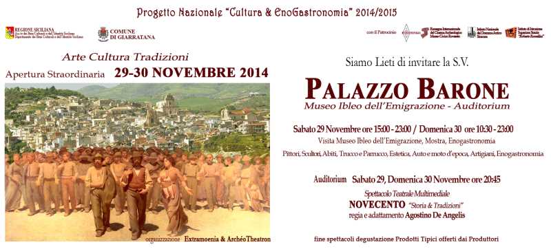 Inoltre, alle ore 20.45, sia del sabato che della domenica, si terrà presso l’Auditorium sito all’interno del palazzo, lo spettacolo Teatrale Multimediale “Novecento”, regia e adattamento di Agostino De Angelis; un viaggio nella letteratura e nelle tradizioni che offre al pubblico l’occasione per un’attenta riflessione sulla memoria storica e sulle manifestazioni culturali del primo Novecento, Italiano e Europeo.