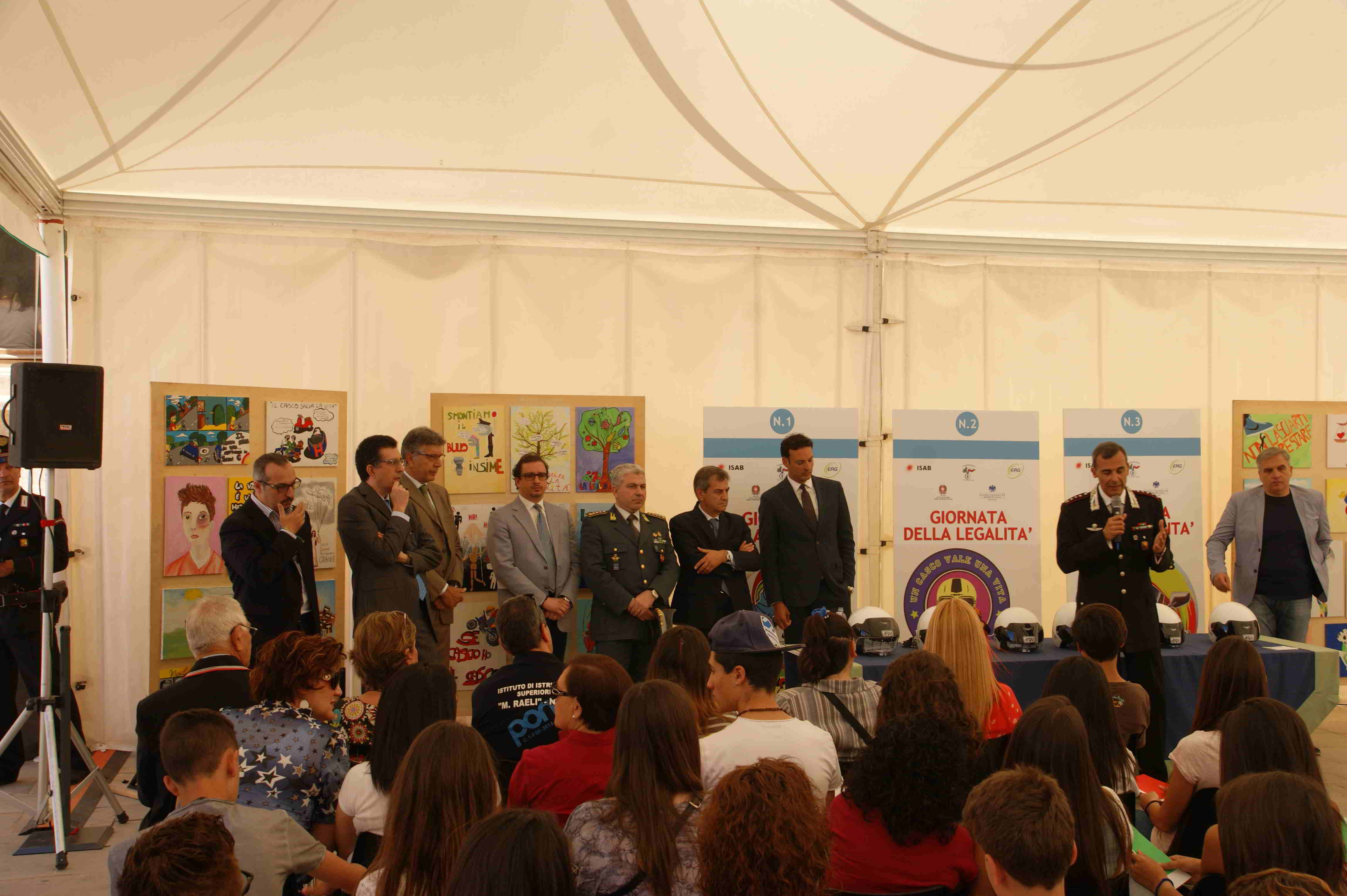 Il Prof. Giuseppe CAPPELLO, rappresentante l’Ufficio Scolastico Territoriale, ha evidenziato sul piano didattico la totale adesione del mondo della scuola al progetto ed al valore simbolico dello stesso, con particolare riguardo quest’anno al tema del bullismo, lodando il profondo impegno e la vulcanica creatività profusi dai ragazzi delle scuole medie e dai tutors dei tre istituti ad indirizzo artistico nella realizzazione delle tele e dei bozzetti per la scelta del logo da apporre sui caschi. Altri due interventi sono stati fatti dal Dott. Giuseppe CONSENTINO, Responsabile Relazioni Territoriali ERG, e dal Dott. Antonio CARUSO, della Direzione Risorse Umane e Relazioni Esterne di ISAB; il primo, annoverando il concorso quale iniziativa principale fra quelle che ERG promuove e conduce quali attività di responsabilità sociale a favore del territorio oltre a quelle per lo sviluppo economico e lavorativo, ha ribadito l’importanza dell’utilizzo del casco ed l’alto valore civico della manifestazione.