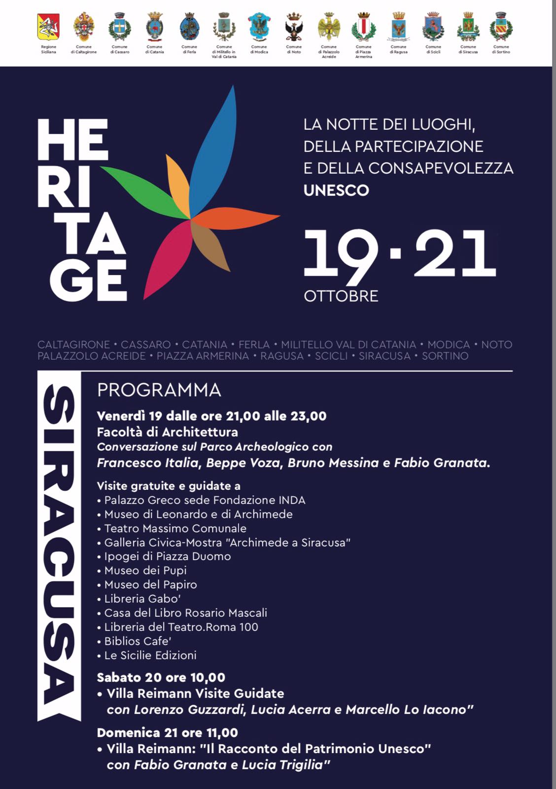 Nel capoluogo aretuseo l’evento si è aperto ieri con una conversazione sul Parco Archeologico e prosegue e con le visite guidate gratuite di Palazzo Greco (sede della Fondazione Inda), Museo di Leonardo e di Archimede, Teatro Massimo Comunale, Galleria Civica, Ipogei di piazza Duomo, Museo dei Pupi, Museo del Papiro, Libreria Gabò, Casa del Libro Mascali, Biblios Cafè e Le Sicilie Edizioni. Infine oggi e domani, si potrà visitare Villa Reimann.