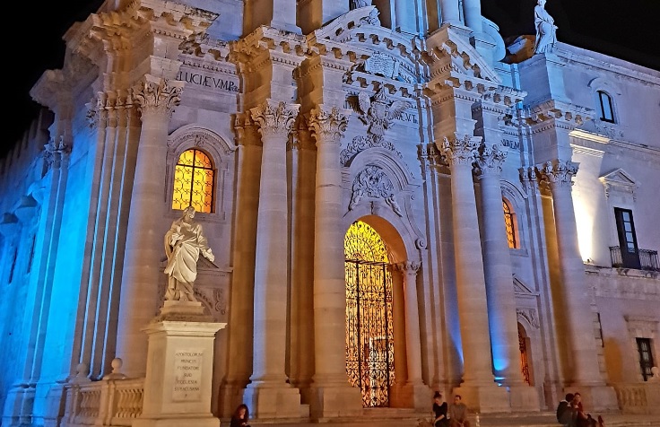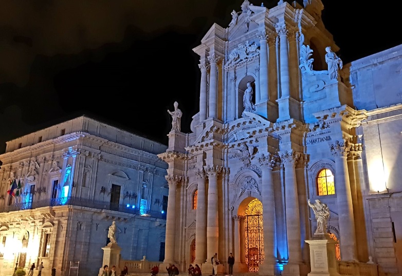 News Siracusa. La Cattedrale di piazza Duomo si illumina di blu per “Heritage – La notte dei luoghi, della partecipazione e della consapevolezza Unesco”. L’evento è organizzato in occasione del quarto “Meeting delle Associazioni Europee dei Siti Patrimonio Mondiale Unesco” sul tema della comunicazione per la promozione e la valorizzazione del patrimonio culturale in Europa.