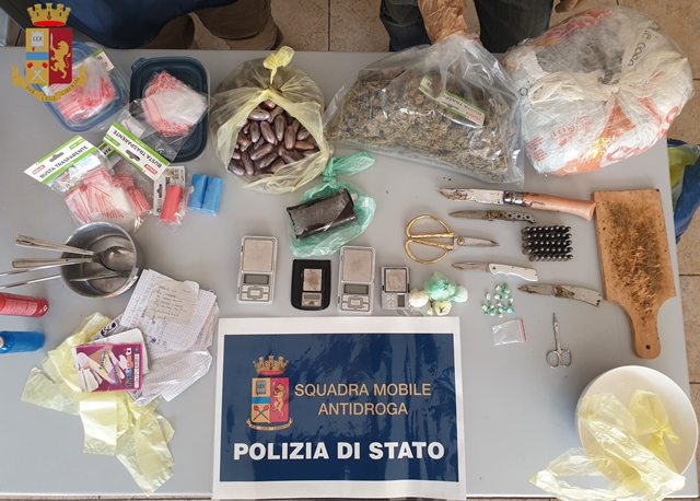 A seguito di predisposti servizi di contrasto al fenomeno dello spaccio di sostanze stupefacenti, gli agenti hanno proceduto ad una perquisizione domiciliare che ha consentito di rinvenire e sequestrare 66 ovuli e un panetto di hashish del peso di 906 grammi, due buste di marijuana del peso di 1.298 grammi, tre involucri contenente cocaina per un peso di 37,50 grammi.