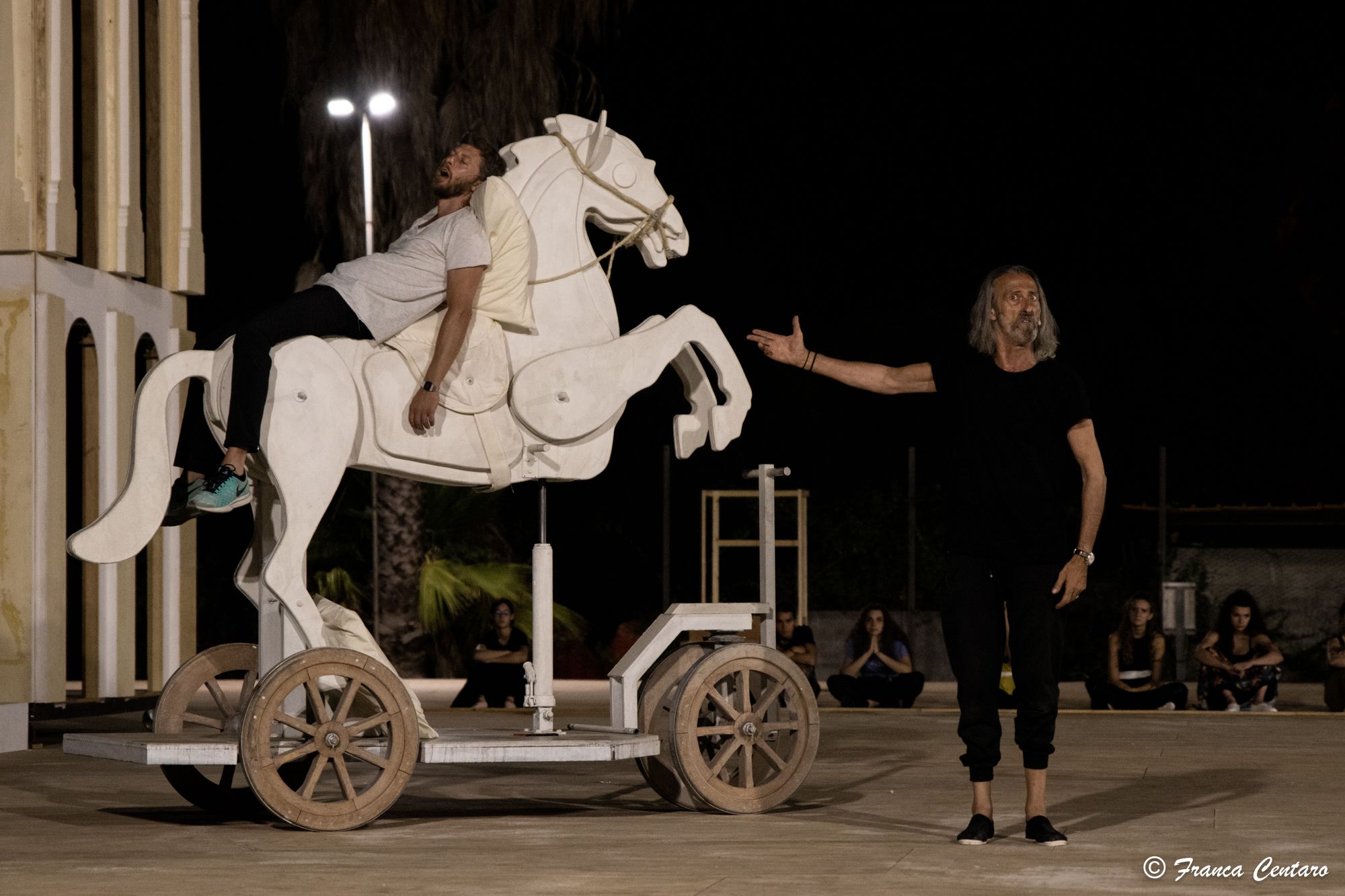 Antonio Calenda è allasua ottava regia al Teatro Greco di Siracusa, la prima commedia dopo le tragedie Aiacedi Sofocle (1988), Prometeodi Eschilo (1994), Agamennone di Eschilo(2001), Coeforedi Eschilo (2001), Persianidi Eschilo (2003), Eumenididi Eschilo (2003), Baccantidi Euripide (2012).