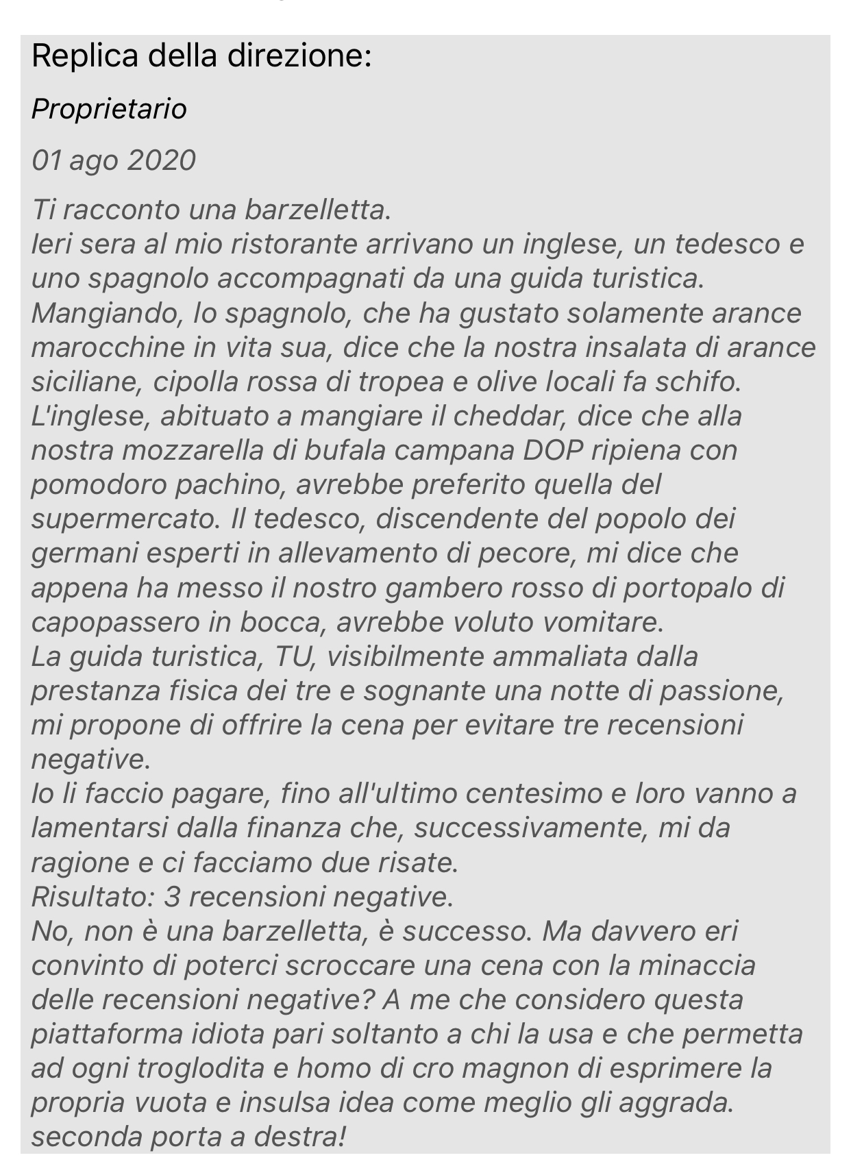 <È inaccettabile – dice la Scala – che un noto ristorante di Marzamemi, facendosi possibilmente scudo con la propria fama, si possa permettere il lusso di insultare per il proprio orientamento sessuale dei clienti che non hanno gradito né la cena né il servizio ricevuto e che il concetto “omofobo” venga ripetuto con ironia anche a seguito di una recensione negativa scritta sulla nota app Tripadvisor>.