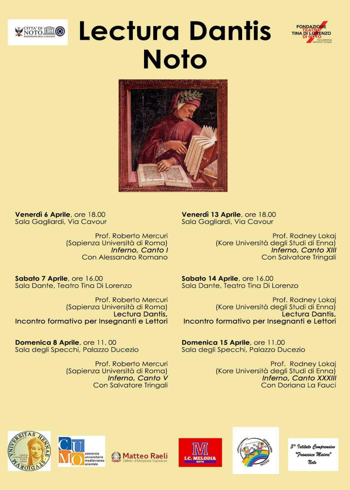 «Nel solco della più longeva tradizione della letteratura italiana – commenta l’assessore alla Cultura del Comune di Noto, Frankie Terranova – Noto apre le porte alla “Lectura Dantis”, proponendo una delle più importanti istituzioni della critica letteraria nella sua declinazione scientifica, partecipativa, specialistica e divulgativa. Sono 2 gli appuntamenti di quest’anno, per ideare un più ampio disegno da sviluppare lungo la prossima stagione, a cui hanno aderito con entusiasmo i professori Mercuri e Rodney quali esponenti illustri del tema in ambito nazionale. Un invito entusiastico dell’assessorato alla Cultura per questi incontri che daranno luce alla lettura esegetica ed espressiva per un pubblico trasversale di amatori e studiosi. È un progetto ambizioso per “ritrovarsi insieme” attorno al sommo poeta e per farne occasione di confronto e di stimolo a nuove iniziative culturali, con l’ambizione di farlo diventare un appuntamento fisso col coinvolgimento dei nostri insegnanti, alunni e attori, amatoriali e non».