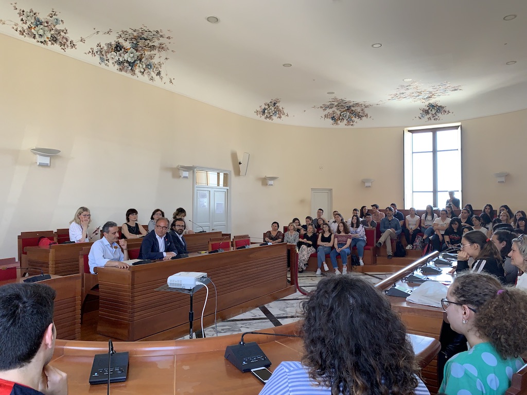 News Noto. L’aula consiliare Corrado Passarello di Palazzo Ducezio ha ospitato questa mattina la cerimonia di consegna degli attestati di partecipazione al progetto “Comunicazione e Informazione” che ha visto coinvolti 86 studenti dell’istituto superiore Matteo Raeli. Progetto giunto alla sua 3^ edizione, realizzato in collaborazione con l’amministrazione comunale e che permesso ai ragazzi del Raeli di partecipare agli eventi organizzati in città vestendo i panni da giornalisti.