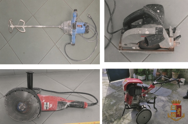 Infine, nel corso dei controlli in via Sonnino, nella zona rupestre in prossimità delle case popolari, gli agenti rinvenivano, occultati all’interno di un sacco di juta, alcuni attrezzi da lavoro, una smerigliatrice, un flex, un’impastatrice per cemento, nonché una motozappa, tutti oggetti provento di furto.