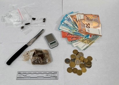 Fatto accesso nell’appartamento, in presenza della proprietaria, una donna di 40 anni, in un mobiletto a scaffali della camera da letto, gli Agenti rinvenivano una scatola di cartone contenente 60 grammi di sostanza stupefacente del tipo hashish, circa 100 bustine in plastica per il confezionamento, un coltello ancora intriso di stupefacente e un bilancino di precisione. Accanto alla scatola era posizionata una cassetta di metallo con 600 euro in contanti, probabile provento dell’attività di spaccio.
