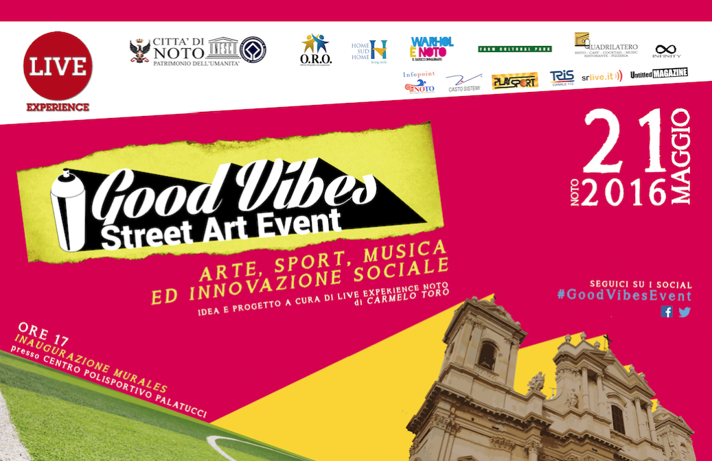 News Noto: si terrà domani alle ore 12, presso la Sale degli Specchi, la conferenza stampa di presentazione del progetto dal titolo “GOOD VIBES! Street Art Event. Arte, Sport, Musica ed Innovazione sociale” a cura di Carmelo Toro e realizzato da Live Experience e Cooperativa sociale Onluss O.R.O. in collaborazione con il Comune di Noto.