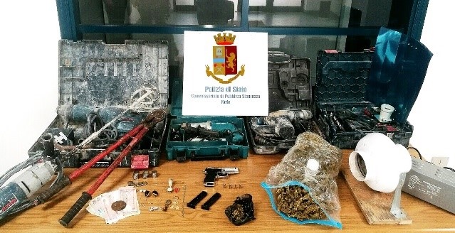 Gli operatori di Polizia perquisivano e setacciavano un vano sottoscala, la cui porta di ingresso si presentava con la serratura forzata, e rinvenivano: una valigetta contenente una pistola scacciacane modificata marca Kimar cal. 8 nonché due caricatori e sei proiettili; una busta in cellophane con all’interno 1,52 chili di marijuana, un bilancino di precisione, un portalampada con pannello in alluminio rifrangente, un ventilatore, un trasformatore, utilizzati per la coltivazione domestica dello stupefacente; 13 banconote di valuta straniera, 54 monete da lire 500 fuori corso; gioielli vari tra cui orecchini, ciondoli, anelli, bracciali, spille, medaglietta e orologio in oro; 3 valigie di attrezzi edilizi contenenti in particolare 5 trapani, 1 martello pneumatico, 1 impastatore, 1 flex, 1 cesoia.