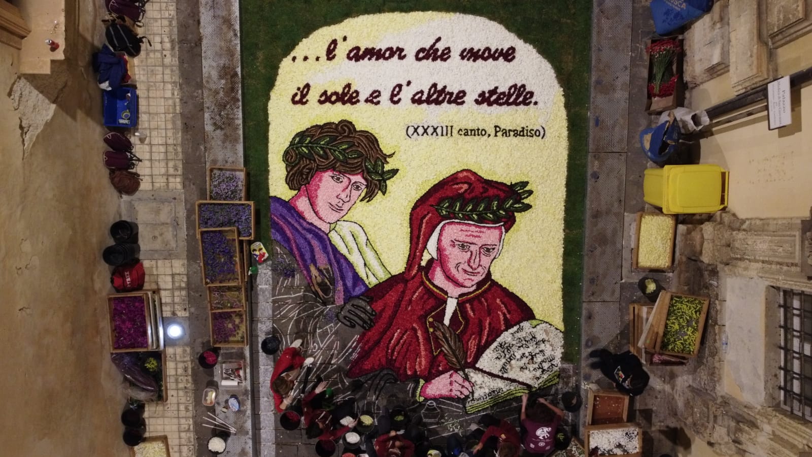 “Dopo l’Infiorata della resistenza, adesso l’Infiorata della ripartenza”. Con queste parole il sindaco Corrado Bonfanti ha dato il via alla 42^ edizione dell’Infiorata di via Nicolaci, quest’anno dedicata a Dante Alighieri, il Sommo Poeta. Fino a tarda sera i maestri infioratori netini hanno lavorato per trasformare l’elegante via del centro storico netino in un prezioso e profumato tappeto infiorato che, causa restrizioni antiCovid-19, non sarà visitabile. Sono stati 8 i bozzetti realizzati, nel rispetto delle normative attualmente in vigore e con il presidio delle forze dell’ordine e dei volontari di Protezione Civile e della Croce Rossa, tutti ispirati a Dante Alighieri: il selciato di via Nicolaci si apre con gli ultimi versi dell’Inferno “E quindi uscimmo a riveder le stelle” e si chiude con gli ultimi versi del Paradiso, e dunque della Divina Commedia, “L’amor che move il sole e l’altre stelle”.