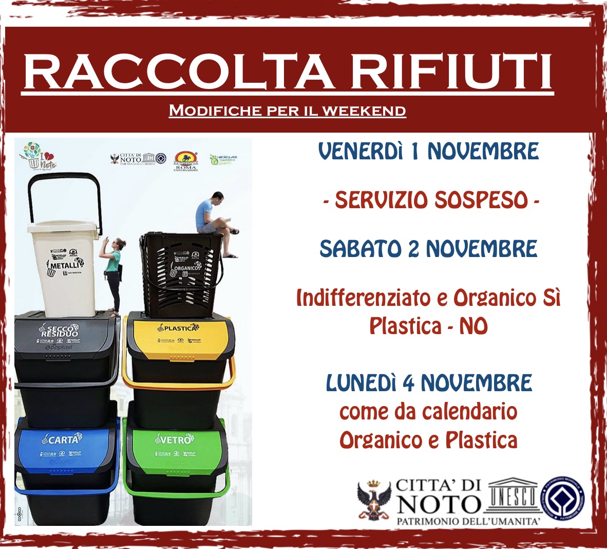 News Noto. Modifiche al calendario per il conferimento dei rifiuti: venerdì 1 novembre, Ognissanti, il servizio di raccolta rifiuti sarà sospeso. Il ritiro dei rifiuti indifferenziati, previsto da calendario ogni venerdì, sarà però recuperato l’indomani, sabato 2 novembre.