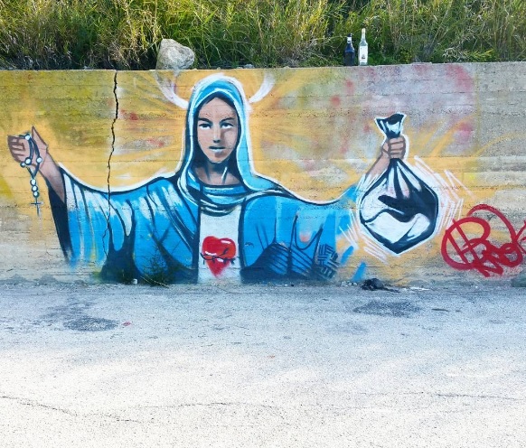 News: “Nostra signora della Munnizza”. Titolo un po blasfemo, un po denuncia. Ecco che arriva la risposta dall’arte di strada sui muri sulla questione rifiuti. Gli autori sono ancora ignoti ma il murales che ritrae una celebre figura della religione cristiana con le braccia aperte e in una delle mani afferra un sacchetto dell’immondizia, è ormai conosciuto.