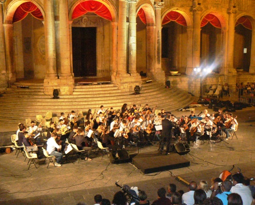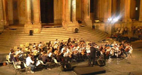 News Noto: un’orchestra di chitarre per il gran finale della quarta edizione di “Tiempo de guitarras”. Piazza Municipio a Noto ha ospitato domenica sera l’evento conclusivo del Festival internazionale della chitarra promosso dall’associazione “Musica & arte” in collaborazione con il Comune. Chitarristi di diverse fasce di età, giovanissimi, ma anche adulti, insegnanti di chitarra, provenienti da varie parti della Sicilia e non solo, che si sono misurati sulle note di grandi classici della musica, diretti da Vito Nicola Paradiso. Un evento originale, un’occasione, come ha detto Paradiso, per i giovani per imparare a suonare insieme ad altri e misurarsi in un esperimento che vuole mettere in risalto il vantaggio della condivisione e del fare musica insieme. Tanti brani suonati: dalle colonne sonore di alcuni film, tra i più noti “Moon river” da “Colazione da Tiffany”, ma anche le note da “Il cacciatore”, per poi passare al tango argentino, ai brani dello stesso Paradiso, che in questi anni ha diffuso il suo metodo “La chitarra volante” per imparare a suonare ad ogni età.