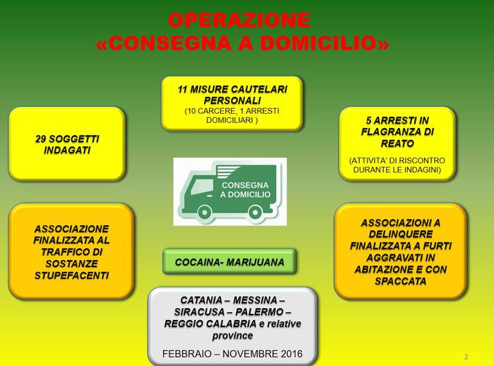 L’operazione è denominata ‘Consegna a domicilio’ perché la casa del principale indagato era divenuta base logistica per la compravendita all’ingrosso e al dettaglio di cocaina e marijuana.