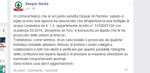 “Vi comunichiamo che in un punto vendita Despar di Pachino, sabato 4 luglio scorso una signora ha denunciato che all’apertura di una bottiglia di acqua Levissima da lt. 1.5, appartenente al lotto n° 5150087105 con scadenza 05/2016, attraverso un foro, è fuoriuscito un liquido che le ha provocato delle ustioni al braccio.