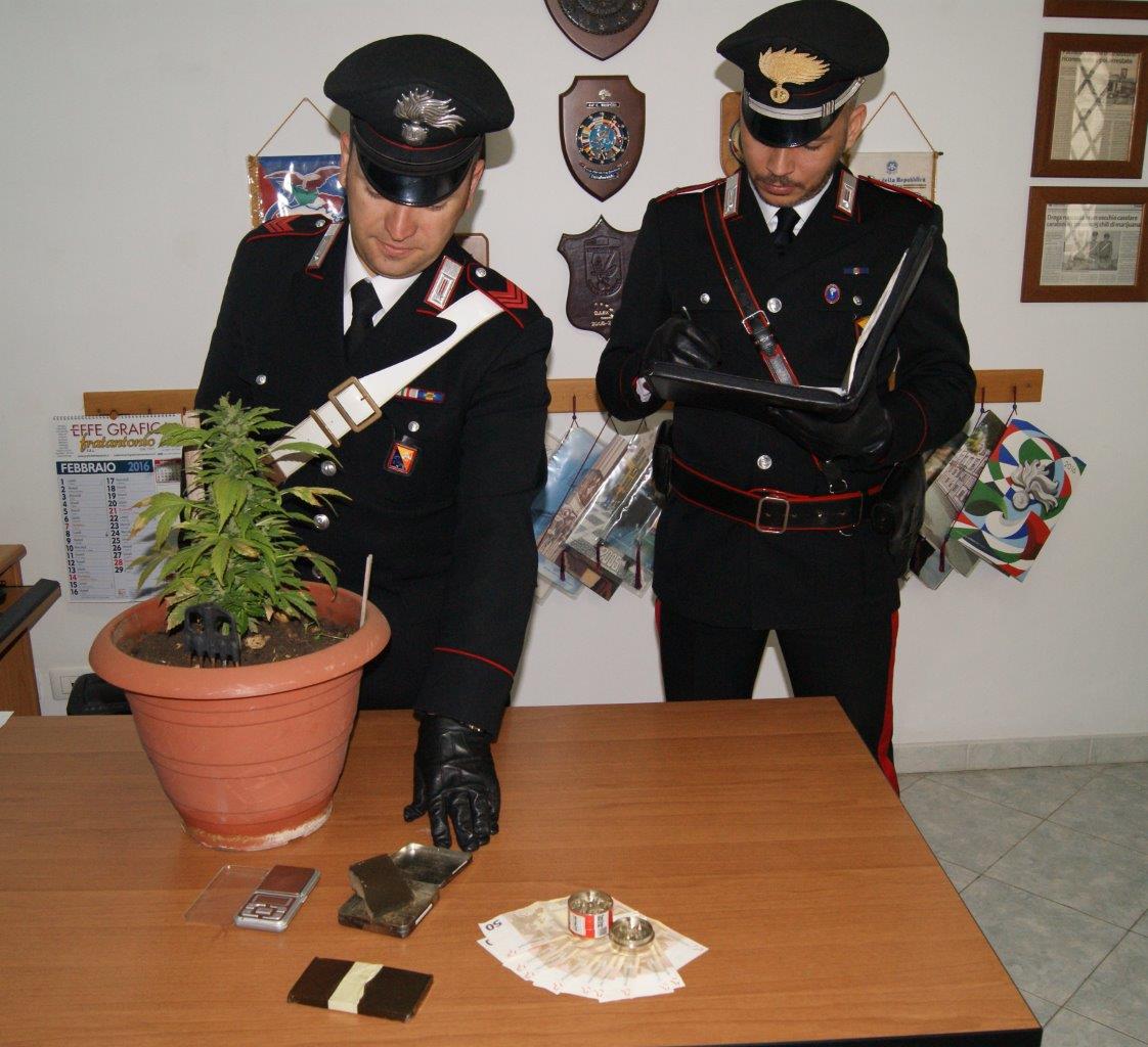 I militari hanno perquisito l’abitazione dell’uomo e, grazie al fiuto di Indic, pastore tedesco del nucleo Cinofili Carabinieri, hanno rinvenuto, all’interno di un piccolo sgabuzzino in legno realizzato artigianalmente sul terrazzo della casa, una piantina di canapa indiana dell’altezza di circa 50 cm e un panetto di hashish dal peso di 100 grammi.