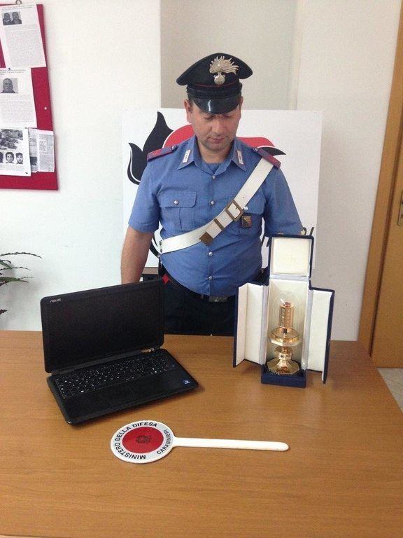 News Pachino: i Carabinieri hanno denunciato in stato di libertà per il reato di ricettazione G. S. classe 1983: il giovane, a seguito di perquisizione domiciliare, veniva trovato in possesso di un computer portatile nonché di una reliquia del Beato Antonio Rosmini asportati nei giorni scorsi dalla chiesa “Madonna Greca Eleusa – Madre della Misericordia” sita a Portopalo di Capo Passero. Nel corso della mattinata odierna la reliquia, un’urna in oro ed argento di pregiata fattura contenente il sangue del Beato Antonio Rosmini, sarà restituita dal Comandante della Stazione al parroco Don Luca Manenti.