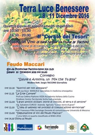 Previsto anche un incontro dibattito dal titolo “SALUTE & ARMONIA UN MIX CHE FA GOLA” ospitato al Feudo Maccari . La scelta al Feudo è stata una scelta voluta perché la forza del vino nella vita contemporanea diventa un perfetto emblema di localismo, territorialità e autenticità in una società sempre più globalizzata e virtuale