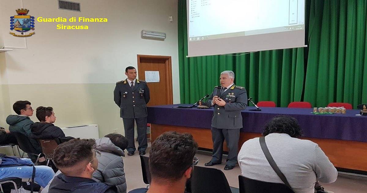 Il preside Prof. Rosario Di Luciano, ha accolto il Comandante Provinciale della Guardia di Finanza di Siracusa Col. Antonino Spampinato ed i finanzieri intervenuti, evidenziando l’importanza della presenza nelle scuole della Guardia di Finanza per far comprendere ai giovani studenti la “convenienza” dell’agire nella legalità come necessità divenuta imprescindibile per una società migliore.