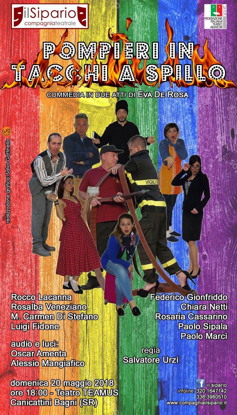 Canicattini Bagni. “Pompieri in tacchi a spillo”, questo il titolo della commedia in due atti, di Eva De Rosa che sarà portata in scena dagli attori della compagnia teatrale canicattinese “Il Sipario”, con la regia di Salvatore Urzì, domenica pomeriggio alle ore 18 al Teamus.