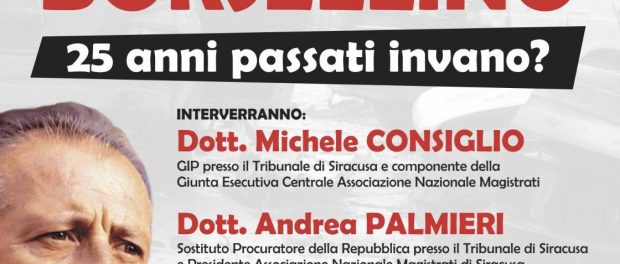 Alle ore 21:00 presso Piazza Garibaldi incontro/dibattito sul tema “In memoria di Paolo Borsellino. 25 anni passati invano?”. Tra i relatori interverranno il Dott. Michele Consiglio, GIP presso il Tribunale di Siracusa e componente della Giunta Esecutiva Centrale Associazione Nazionale Magistrati; il Dott. Andrea Palmieri, Sostituto Procuratore della Repubblica presso il Tribunale di Siracusa e Presidente Associazione Nazionali Magistrati di Siracusa. Modererà il giornalista Pippo Cascio. Il dibattito sara trasmesso in diretta su Canale 8 News.