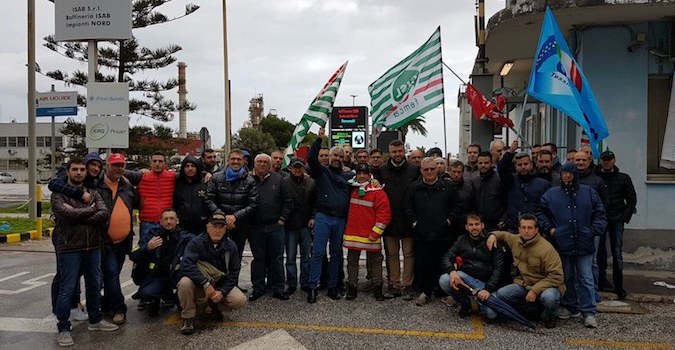 News Siracusa: braccia incrociate per i 150 lavoratori del consorzio Priolo Servizi. Hanno cominciato questa mattina e proseguiranno ancora davanti la portineria nord di Lukoil.